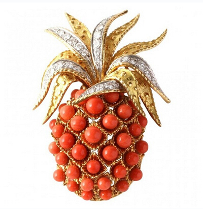 卡地亞珠寶品牌設(shè)計的菠蘿胸針:頂著燦金亮銀的葉子高調(diào)招搖的橙色菠蘿看起來一點兒都不扎手,也真難為了設(shè)計師能將金屬雕琢成如此柔軟隨意的樣子。這樣圓潤調(diào)皮的大菠蘿最適合朋友小聚時佩戴,分分鐘成為視線焦點。