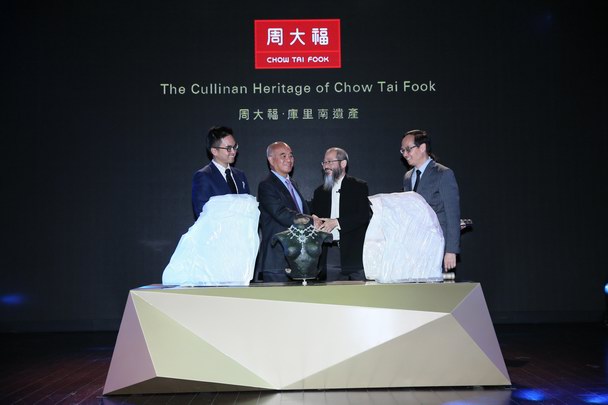 周大福珠寶集團(tuán)主席鄭家純博士(左二)與珠寶藝術(shù)家Wallace Chan (右二)主持「庫里南遺產(chǎn)」珠寶杰作 -《裕世鉆芳華》發(fā)布儀式