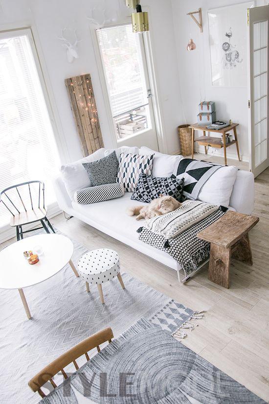 小空間面積不大,拋開傳統(tǒng)的1+2+3組合沙發(fā),直接放一張三人位沙發(fā),搭配1-2個(gè)蒲團(tuán)坐墩,圓形的小茶幾不僅讓整理空間看起來更寬敞,而且活潑生動(dòng)了許多。